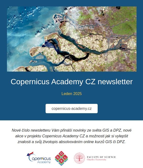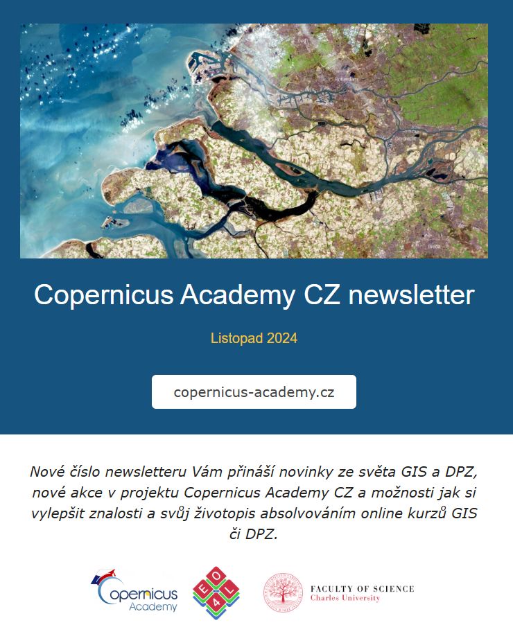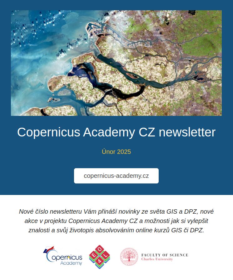 💡Výzkumný tým EO4Landscape z Katedra aplikované geoinformatiky a kartografie, PřF UK rozesílá každý měsíc newsletter Copernicus Academy CZ s novinkami ze světa GIS a dálkového průzkumu Země, nadcházejícími akcemi a příležitostmi, jak si vylepšit životopis prostřednictvím školení.